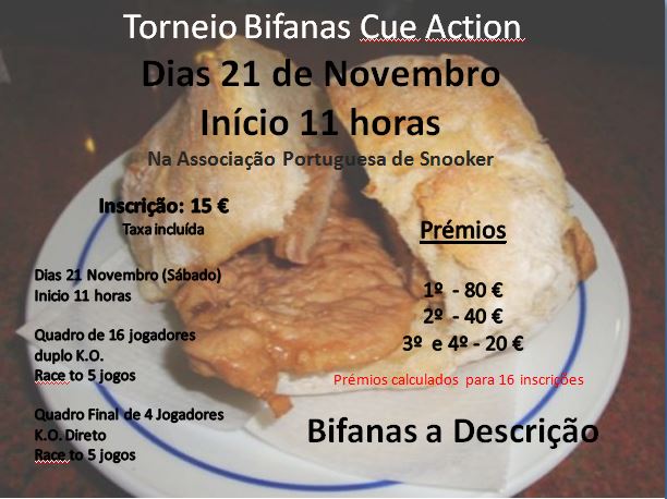 A Cue Action vai realizar nos dias 21 de Novembro um torneio de Bifanas de Pool Português com os seguintes moldes: